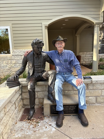 I was sitting in the 95-degree heat. About halfway through the session, the Sun had shifted, and I was no longer in the shade of large oaks. I moved over and sat next to a life-size statue of Mark Twain, which drew chuckles from the group. I propped my arm holding the iPhone on his arm. A couple of people leaving the library guessed I was trying to pose for a selfie. I explained I was on a Zoom call, but succumbed to the second insistent woman, since I did want a selfie.